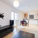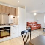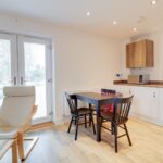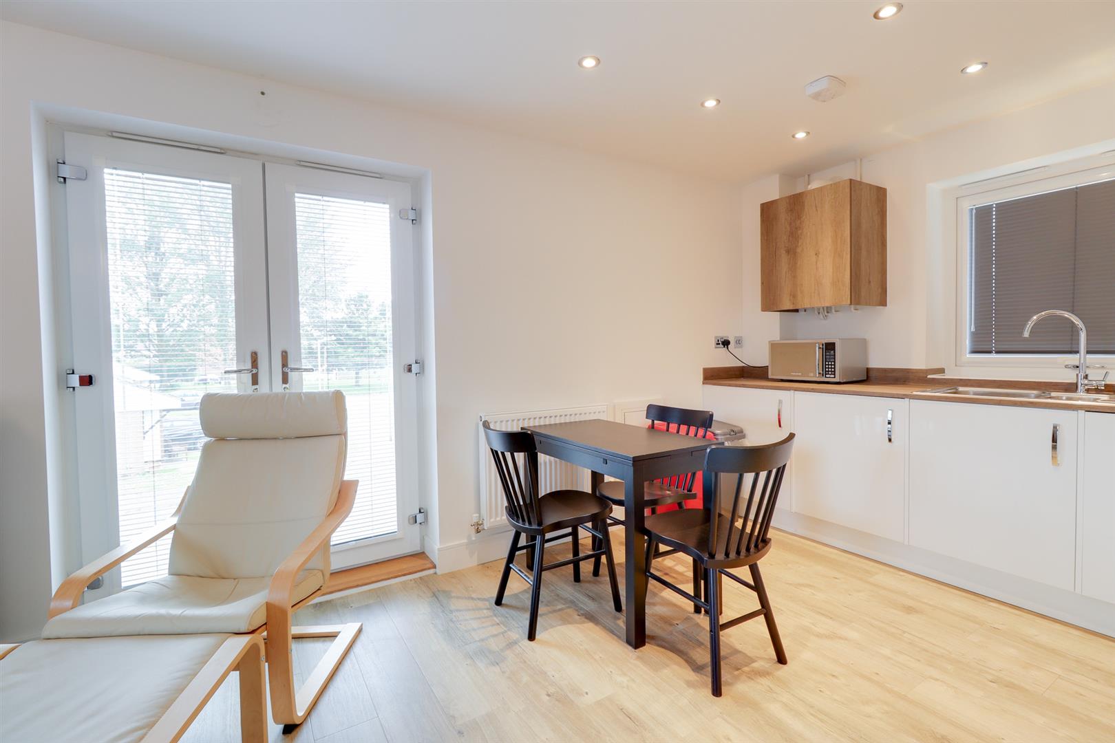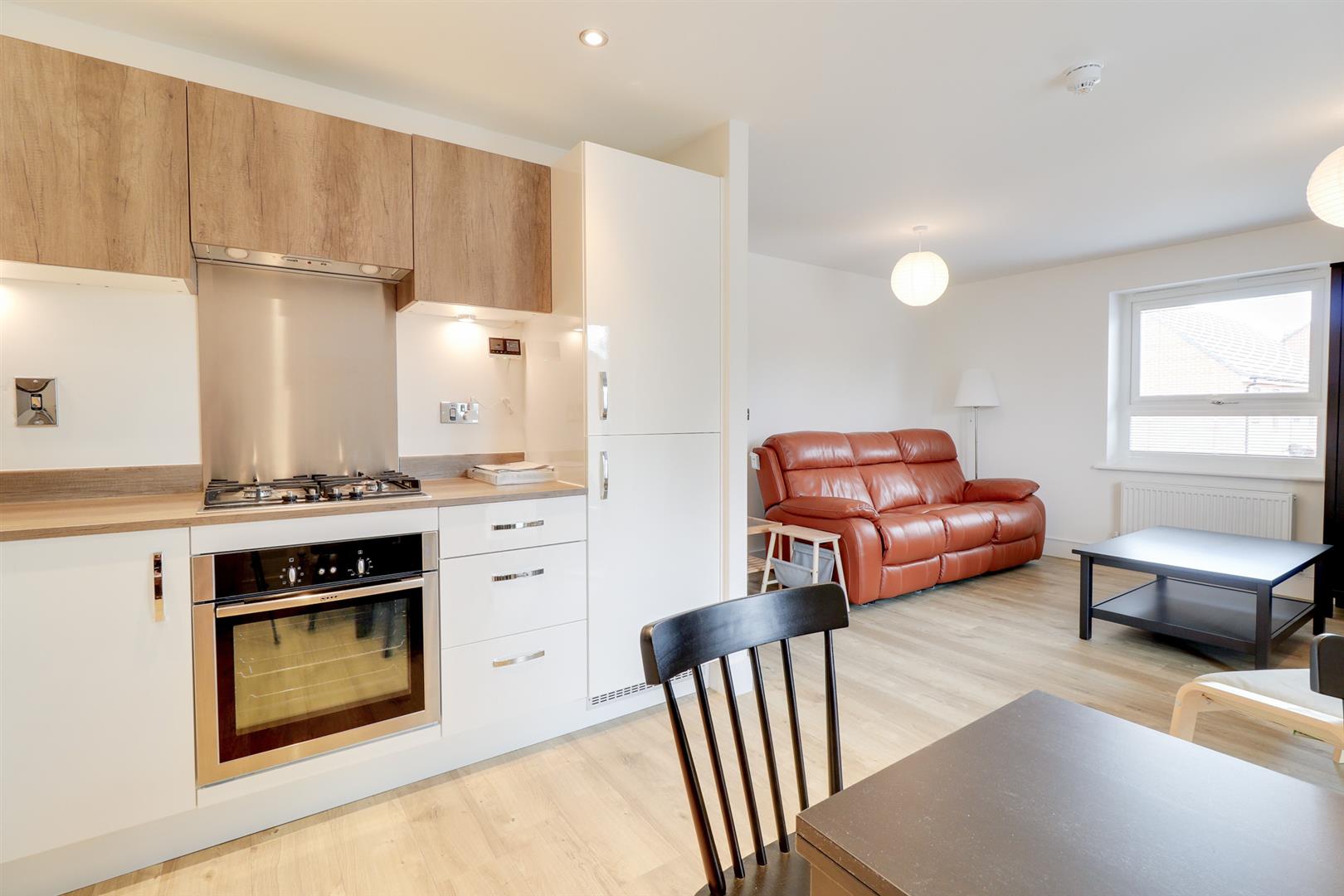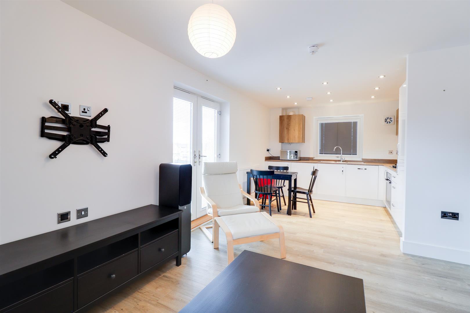 The accommodation is thoughtfully arranged, centred around a light filled open plan sitting, dining and kitchen space. This is a particularly inviting room, enhanced by a Juliet balcony which allows for an excellent degree of natural light and an attractive sense of openness.